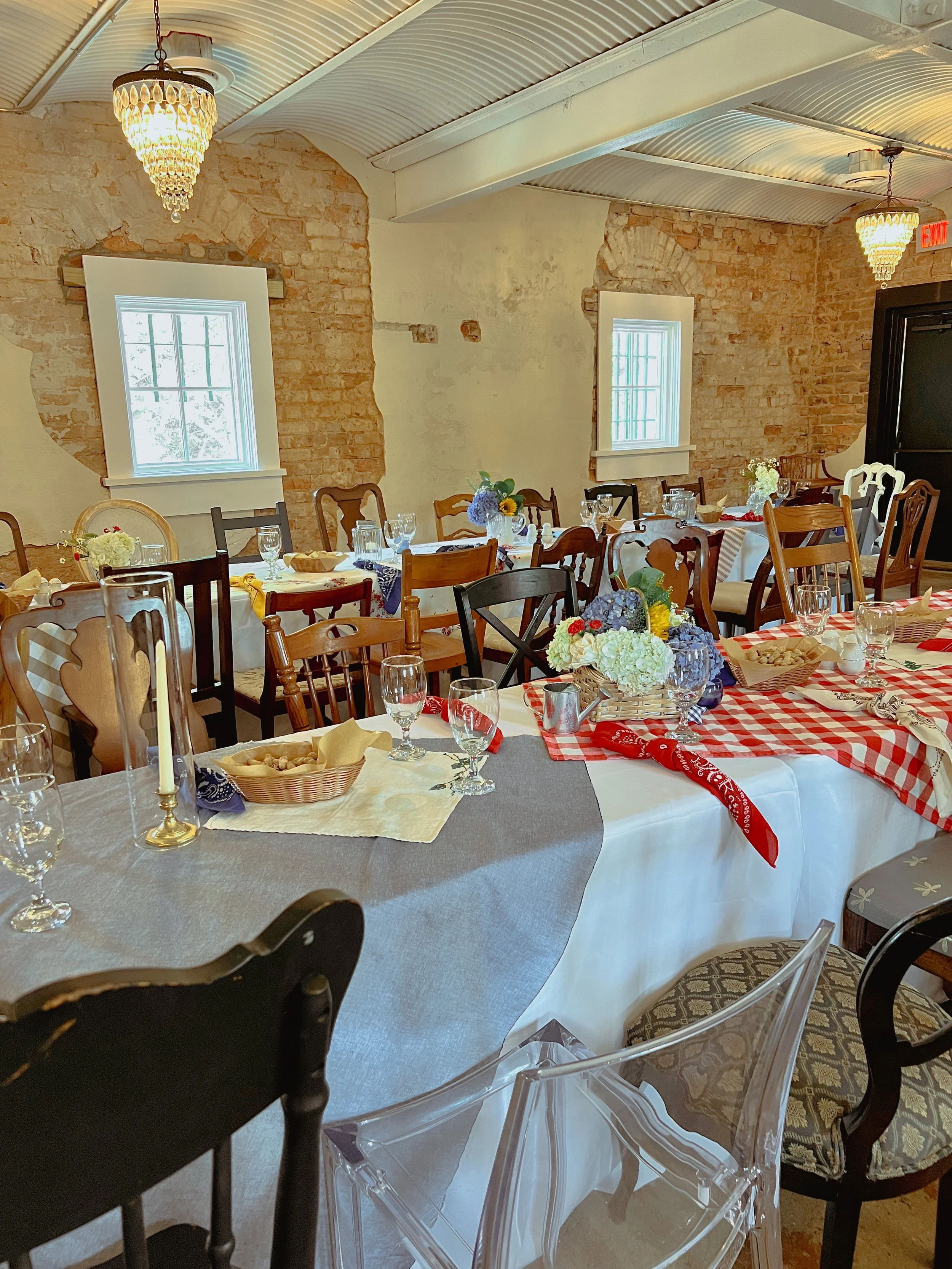 At our historic venue, we believe that casual and elegant can go hand in hand. The mismatched chairs, vintage tablecloths, and the mouthwatering pie and pickle bars came together to create a BBQ experience that was not only delicious but also charming and unforgettable. So, whether you're planning a laid-back celebration or a formal affair, let our venue be the canvas for your dreams to come true. Until next time, cheers to good food, great company, and vintage charm!
